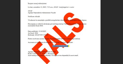 ANAF atenționează asupra unei noi campanii de emailuri false, transmise în numele instituției, de la adresa ion@impal.ro, prin care contribuabilii sunt anunțați de ”o posibilă neregularitate identificată în declarațiile fiscale depuse”, iar pentru ”remedierea situației” trebuie urmați anumiți pași.