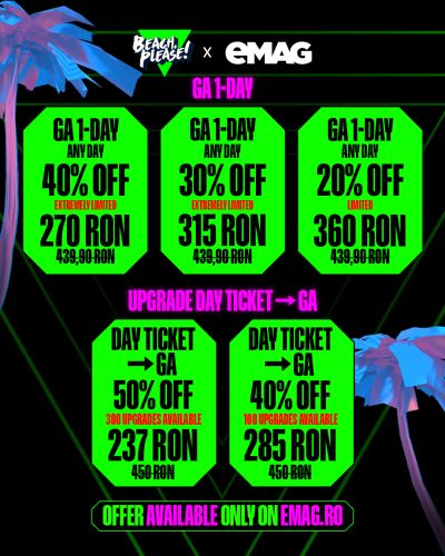 Beach, Please! lansează, în parteneriat cu eMAG, o campanie limitată de vânzare a biletelor de o zi, cu reduceri de până la 50%, disponibilă exclusiv pe emag.ro în perioada 31 martie – 2 aprilie, în limita stocului disponibil.