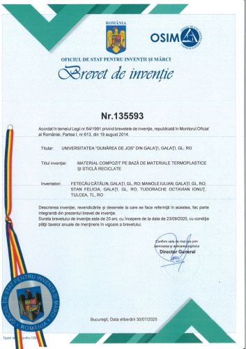Oficiul de Stat pentru Invenții și Mărci (OSIM) a acordat brevetul de invenție nr. 135593 pentru un procedeu inovator de realizare a unui material compozit pe bază de materiale și sticlă reciclate, rezultat al unei  echipe de cercetare din județele  Galați și Tulcea. Echipa de inventatori este formată din prof. univ. dr. ing. Cătălin Fetecău, prof. dr. ing. Felicia Stan și Iulian Manole, de la Facultatea de Inginerie din Galați, și Ionuț Octavian Tudorache, directorul JT Grup Tulcea.
