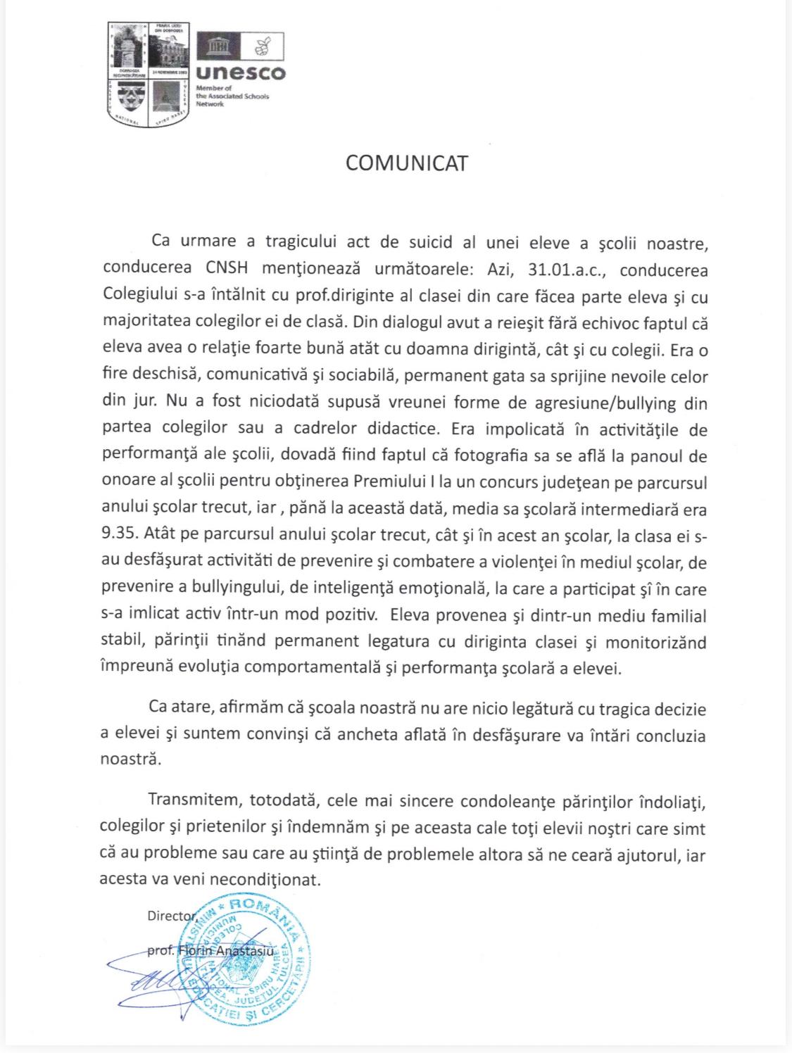 Ca urmare a tragicului act de suicid al unei eleve a școlii noastre, conducerea CNSH menționează următoarele: