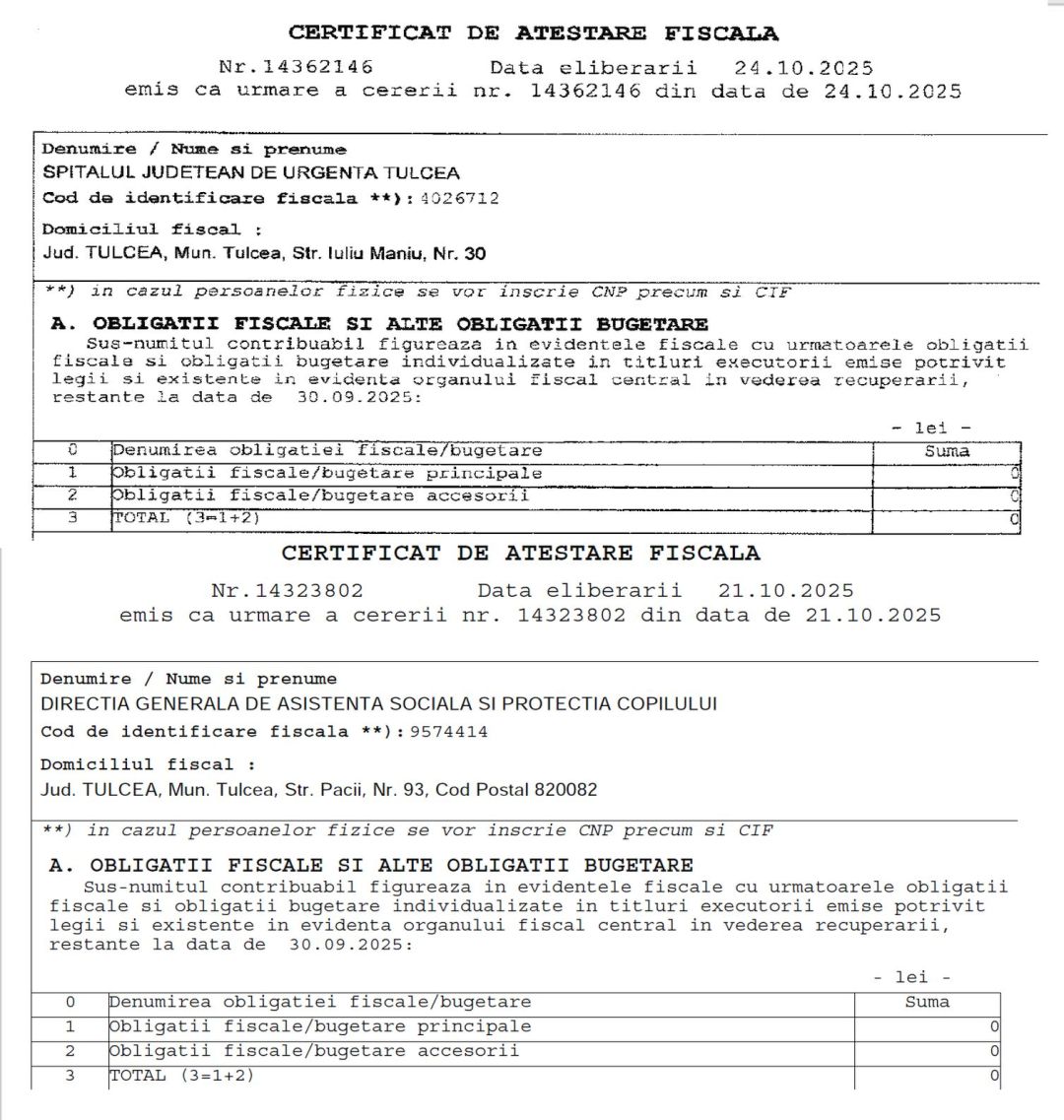 Conform Certificatului de atestare fiscală nr. 14362146 din 24 octombrie 2025, Spitalul Județean de Urgență Tulcea nu are obligații fiscale, nici alte obligații bugetare.